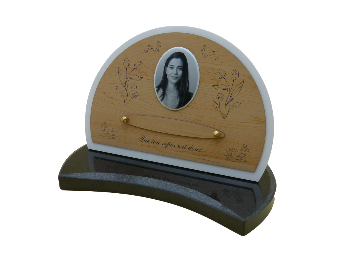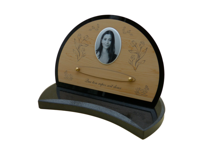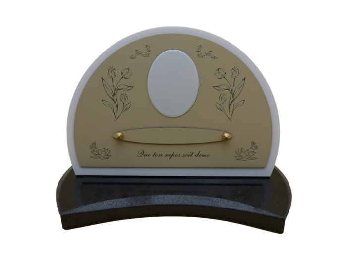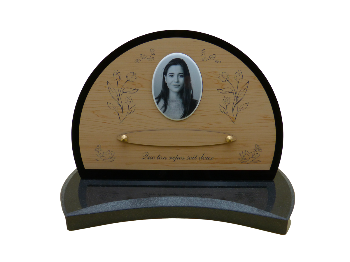 L’alliance parfaite d’une plaque funéraire 280 mm, sertie d’un médaillon en porcelaine italienne. Une personnalisation photo de grande qualité en mémoire de vos proches.